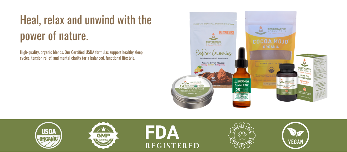 At Restorative Botanicals, we believe in the natural power of hemp to support the body’s interconnected systems. That’s why we use only the highest quality, organically grown hemp in our products. Our premium formulas are thoughtfully blended with other effective ingredients to provide a variety of unique functional benefits. From discomfort relief to help relaxing after a busy day, our blends offer fast and effective support for a balanced, healthy lifestyle.